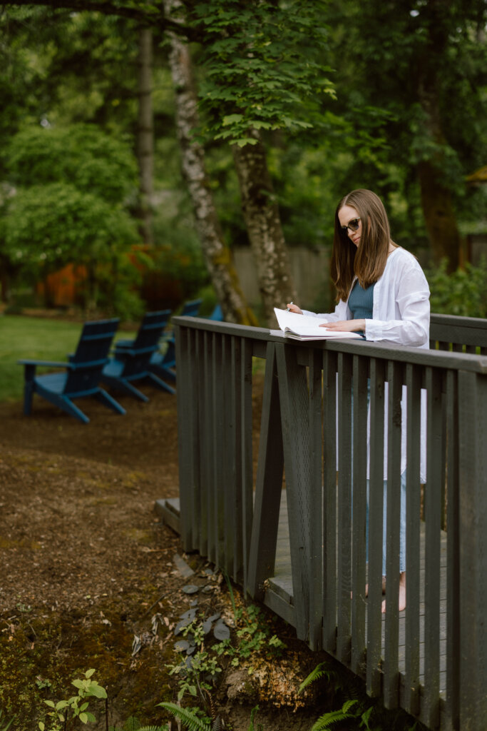 Comfortable layers for Pacific Northwest weather that changes fast. Swimsuit for sauna sessions. Water bottle. Journal and pen. Any medications or supplements. Movement clothes that work wet or dry – we’ll be near the creek. Sandals that can get wet.